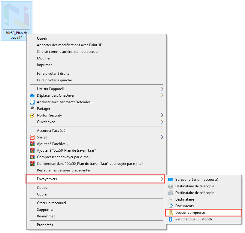 Pour compresser vos fichiers, faites un clic droit sur le fichier demandé puis “Envoyer vers” → “Dossier compressé”