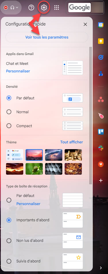 Pour accéder aux paramètres de signature dans Gmail, cliquez sur la roue crantée ⚙️ en haut à droite de la fenêtre. Une barre latérale s’ouvre, dans celle-ci, cliquez sur “Voir tous les paramètres”.