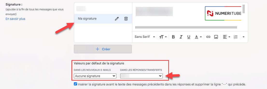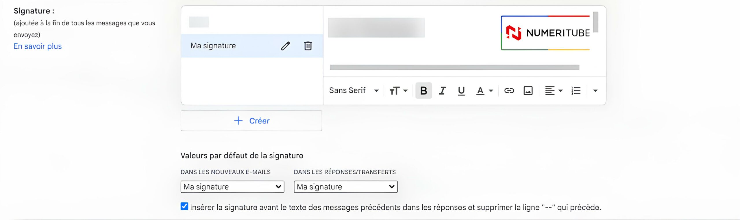 Vous êtes maintenant en face des paramètres de signature Gmail.