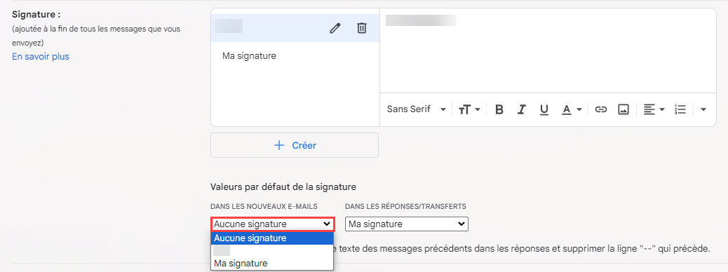 Vous pouvez désactiver l’option “Valeur par défaut de la signature” en choisissant “Aucune signature” dans la liste déroulante.
