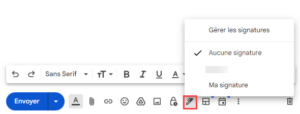 Vous pourrez ensuite choisir de l’ajouter ou non depuis l’écriture de votre mail en cliquant sur l’icône en forme de stylo parmi les options en bas.